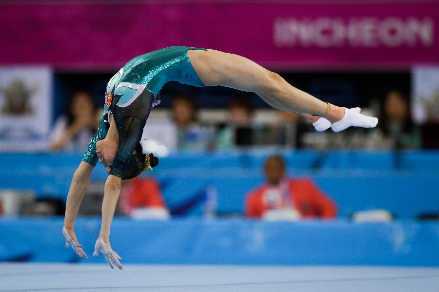 Yao Jinnan of China performs during the women's floor exercise final of gymnastics artistic event at the 17th Asian Games in Incheon, South Korea, Sept. 25, 2014. Yao Jinnan claimed the title with 13.966 points. (Xinhua/Zheng Huansong)