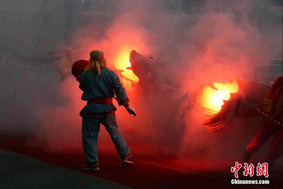 70-year-old men perform fire-dragon dance to celebrate the opening the 21st South Dstrict (Qingdao) senior games in Qingdao Tiantai stadium on Sept. 24, 2014. More than 3,000 old men between 60 and 70 years took part in the games. (Chinanews.com/Xu Chongde)