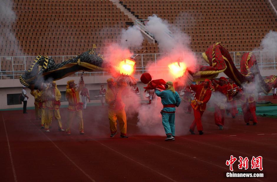 | 70-year-old men perform fire-dragon dance to celebrate the opening the 21st South Dstrict (Qingdao) senior games in Qingdao Tiantai stadium on Sept. 24, 2014. More than 3,000 old men between 60 and 70 years took part in the games. (Chinanews.com/Xu Chongde) |