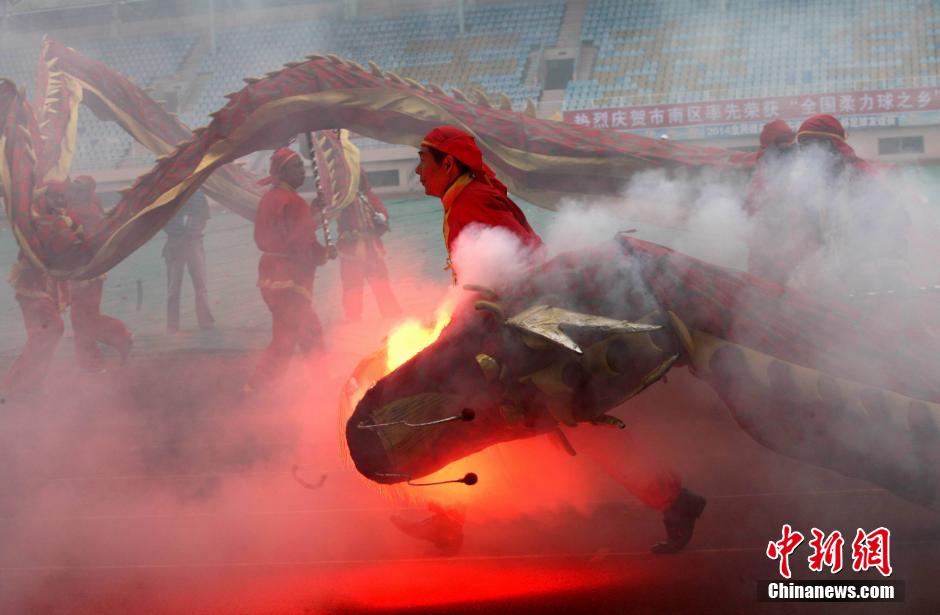 70-year-old men perform fire-dragon dance to celebrate the opening the 21st South Dstrict (Qingdao) senior games in Qingdao Tiantai stadium on Sept. 24, 2014. More than 3,000 old men between 60 and 70 years took part in the games. (Chinanews.com/Xu Chongde)
