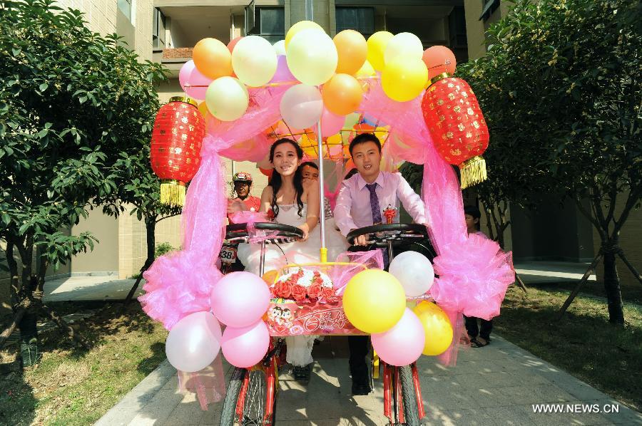 Bride Jiang Yan and bridegroom Huang Bo ride a four-wheel wedding bicycle in Changsha, capital of central China's Hunan Province, Sept. 27, 2014. The couple, together with their riding mates, celebrated their wedding by riding bicycles on Saturday. (Xinhua/Li Ga)