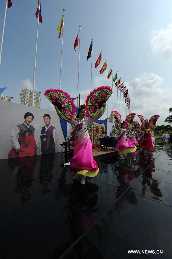 Actresses perform during a wedding ceremony at the flag plaza of athletes' village of the 17th Asian Games in Incheon, South Korea, Sept. 27, 2014. A South Korean traditional wedding ceremony with a theme of "a festival event has been held" was held here on Saturday. The ceremony is for actual marriage of one of the Incheon Asian Games Organizing Committee (IAGOC). (Xinhua/He Changshan)