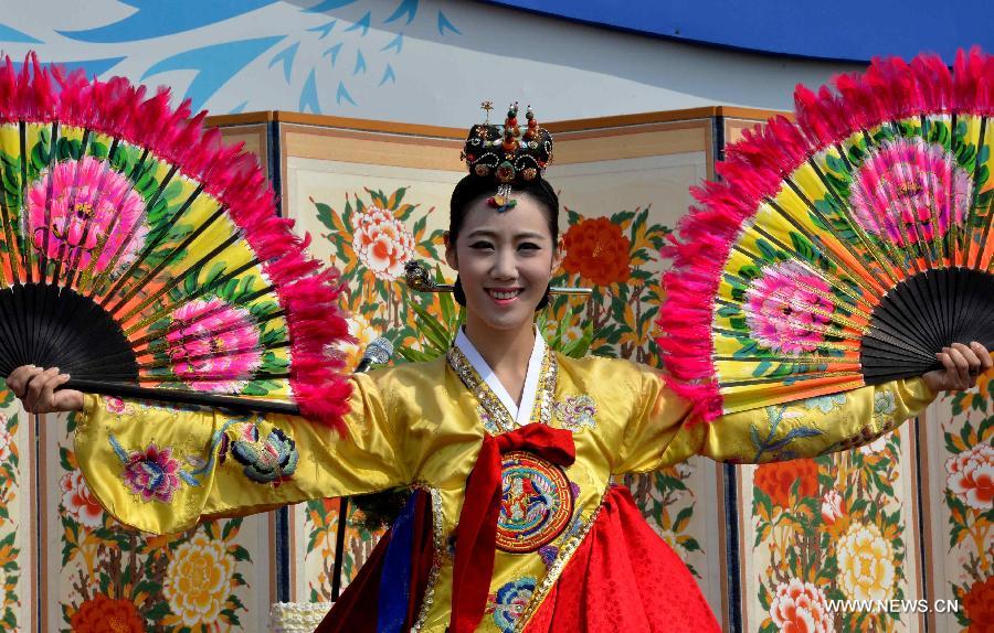 An actress performs during a wedding ceremony at the flag plaza of athletes' village of the 17th Asian Games in Incheon, South Korea, Sept. 27, 2014. A South Korean traditional wedding ceremony with a theme of "a festival event has been held" was held here on Saturday. The ceremony is for actual marriage of one of the Incheon Asian Games Organizing Committee (IAGOC). (Xinhua/He Changshan)
