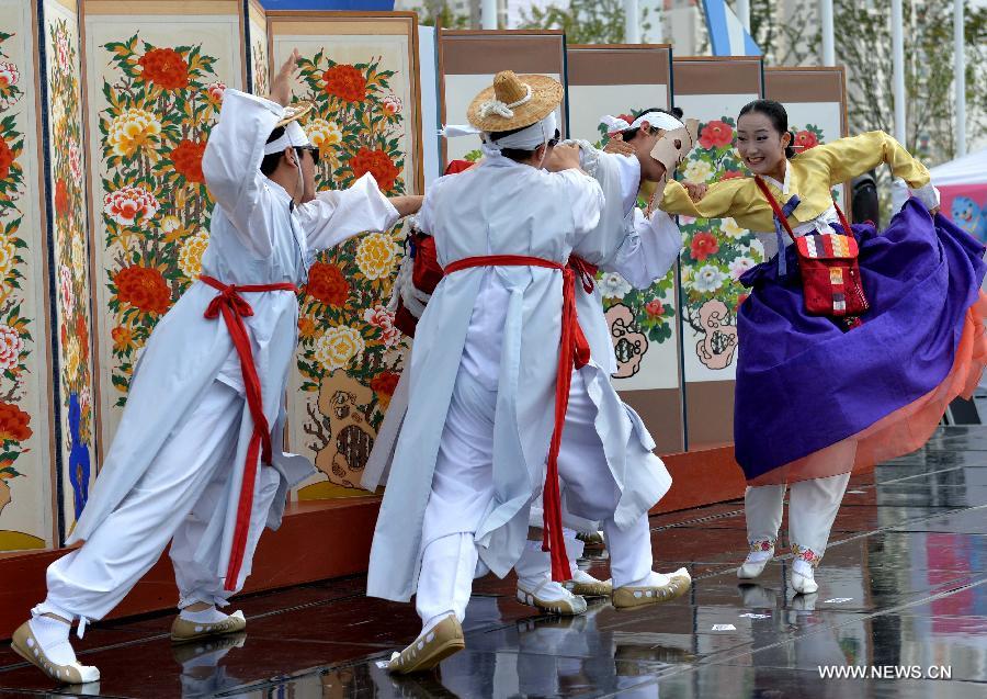 Actors perform during a wedding ceremony at the flag plaza of athletes' village of the 17th Asian Games in Incheon, South Korea, Sept. 27, 2014. A South Korean traditional wedding ceremony with a theme of "a festival event has been held" was held here on Saturday. The ceremony is for actual marriage of one of the Incheon Asian Games Organizing Committee (IAGOC). (Xinhua/He Changshan)