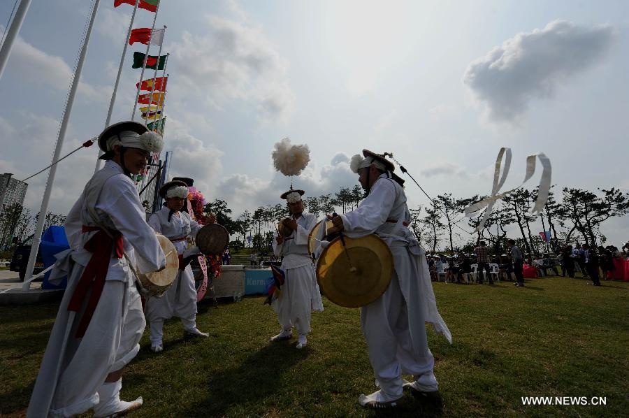 Actors perform during a wedding ceremony at the flag plaza of athletes' village of the 17th Asian Games in Incheon, South Korea, Sept. 27, 2014. A South Korean traditional wedding ceremony with a theme of "a festival event has been held" was held here on Saturday. The ceremony is for actual marriage of one of the Incheon Asian Games Organizing Committee (IAGOC). (Xinhua/He Changshan)
