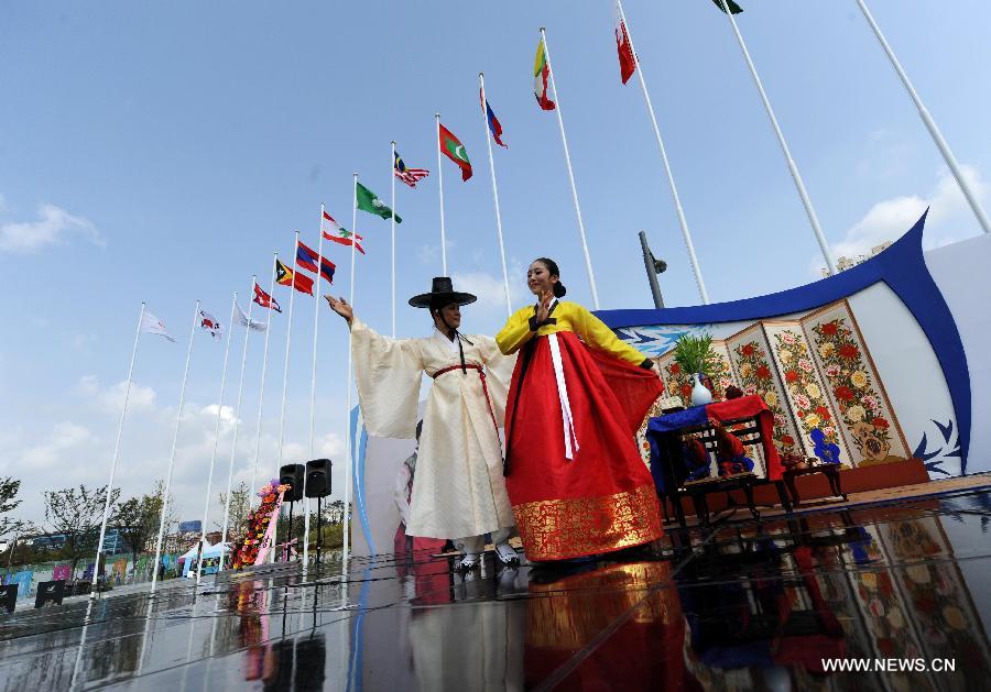 Actors perform during a wedding ceremony at the flag plaza of athletes' village of the 17th Asian Games in Incheon, South Korea, Sept. 27, 2014. A South Korean traditional wedding ceremony with a theme of "a festival event has been held" was held here on Saturday. The ceremony is for actual marriage of one of the Incheon Asian Games Organizing Committee (IAGOC). (Xinhua/He Changshan)
