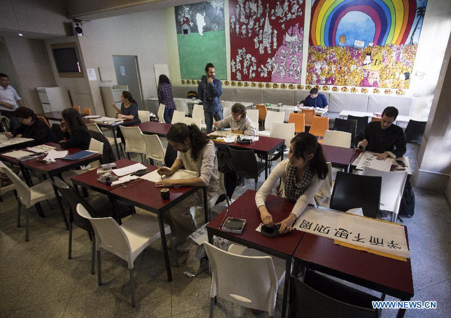 People take part in the Chinese calligraphy competition organized by the Confucius Institute of the University of Buenos Aires, at the University Language Center, as part of the celebration of the 10th anniversary of Confucius Institutes in the city of Buenos Aires, capital of Argentina, on Sept. 27, 2014. The Day of the Confucius Institute is celebrated worldwide on Sept. 27. (Xinhua/Martin Zabala)