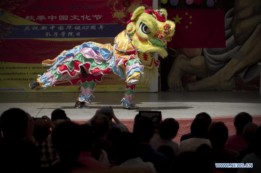 Visitors watch Chinese lion dance during the 2014 Chinese Cultural Autumn Festival, in the framework of the Day of the Confucius Institute, in Mexico City, capital of Mexico, on Sept. 27, 2014. The Day of the Confucius Institute is celebrated worldwide on Sept. 27. (Xinhua/Alejandro Ayala)