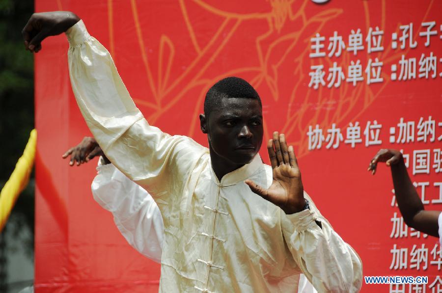 Ghanaian students play Taichi during a ceremony organized by the Confucius Institute of the University of Ghana in Accra, capital of Ghana, on Sept. 27, 2014. The activity took place as part of the celebrations for the Day of the Confucius Institute. (Xinhua/Lin Xiaowei)