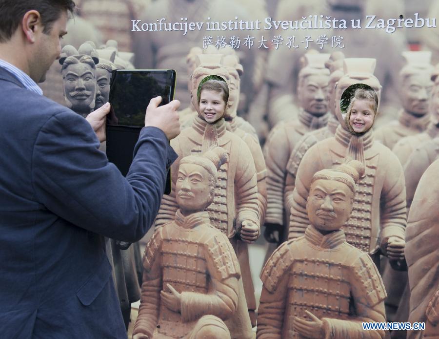 A man takes pictures of two children and replicas of terra-cotta warriors during Confucius Institute Day in Zagreb, capital of Croatia, Sept. 27, 2014. The Day of the Confucius Institute is celebrated worldwide on Sept. 27, marking the 10th anniversary of the founding of Confucius Institutes. (Xinhua/Miso Lisanin)