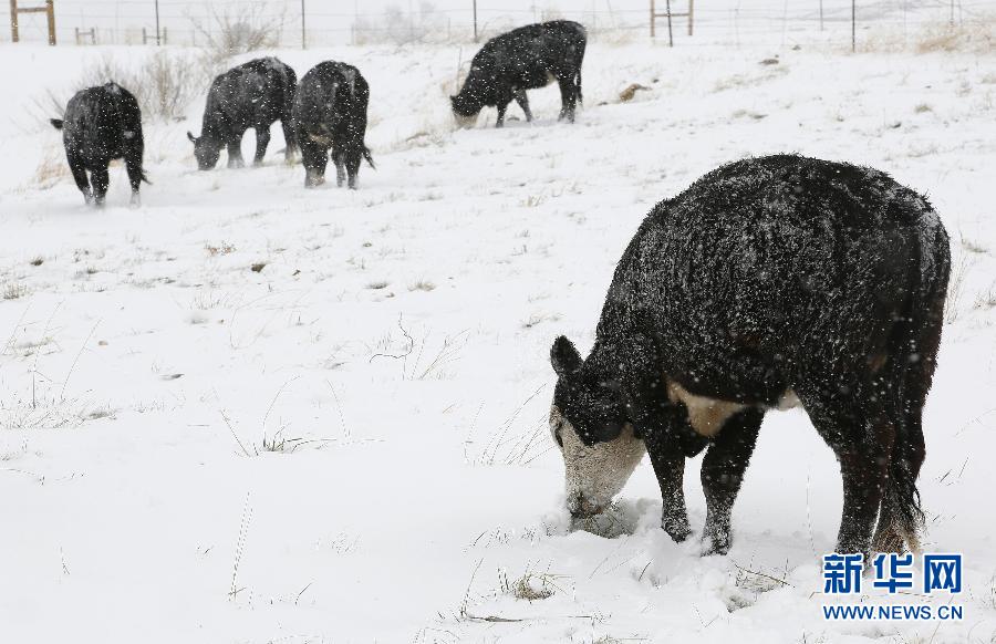 A group of cattle tries to find food on the grass covered with snow in Arvada of Colorado, US, May 1, 2013. (Photo/Xinhuanet)