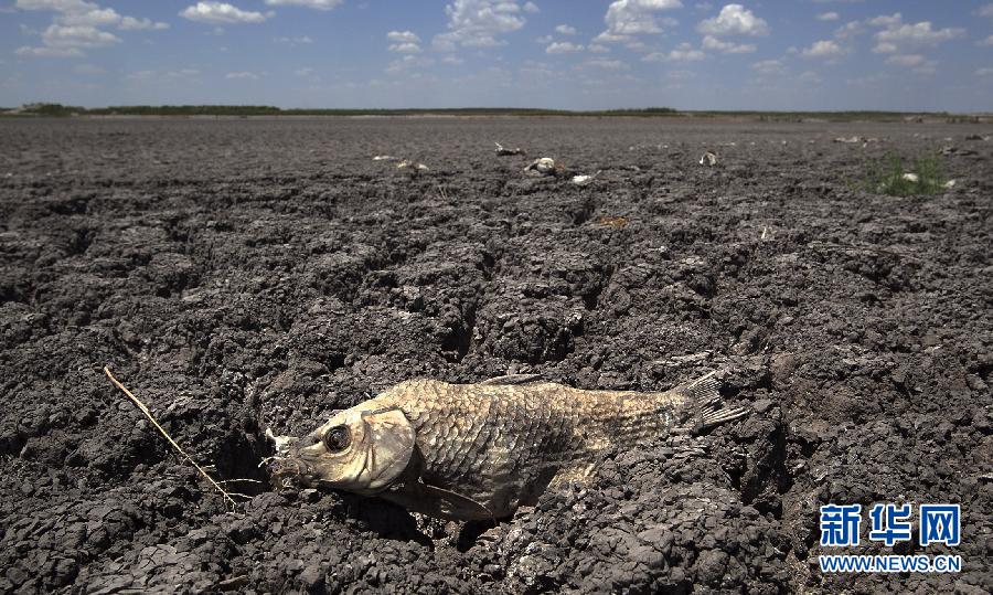 | A dead fish lies on the dried-up river beds in San Angelo of Texas, US, Aug. 3, 2011. (Photo/Xinhuanet) |