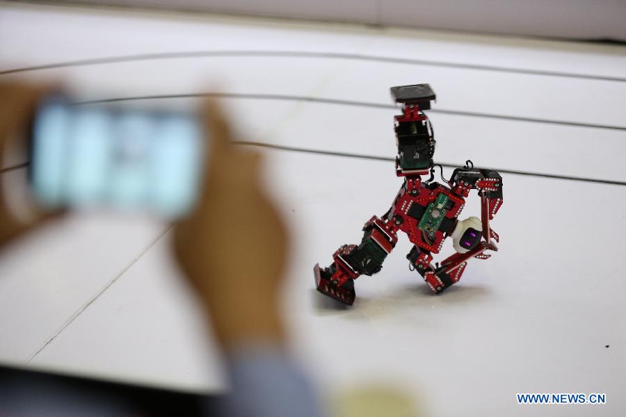 A robot dances during the second college students robot competition of north China's Tianjin Municipality, Sept. 28, 2014. Teams from nine universities and colleges participated in the competition which kicked off at Tianjin Polytechnic University Sunday. (Xinhua)