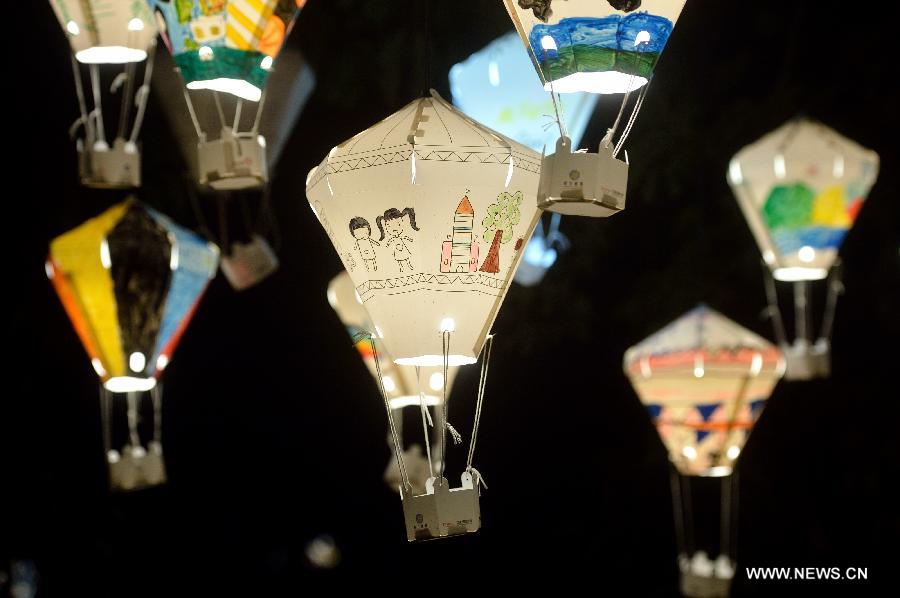 Colorful lanterns are seen at Tiehua Music Village in Taitung, southeast China's Taiwan, late Sept. 28, 2014. Artists and locals made and painted some 3,000 hot-air-balloon-shaped lanterns this summer to decorate the nearby meadow of the village, echoing the annual balloon fiesta of the city. (Xinhua/Wang Qingqin)