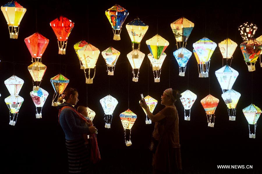 A family takes photos by colorful lanterns at Tiehua Music Village in Taitung, southeast China's Taiwan, late Sept. 28, 2014. Artists and locals made and painted some 3,000 hot-air-balloon-shaped lanterns this summer to decorate the nearby meadow of the village, echoing the annual balloon fiesta of the city. (Xinhua/Wang Qingqin)