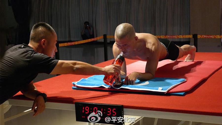 As reported by the official microblog site of Beijing Public Security Bureau on Sept. 26, Mao Weidong, a 43-year-old Special Weapons and Tactics (SWAT) member, breaks the Guinness World Record for "longest time in an abdominal plank position" with a record of four hours and twenty six minutes, smashing the previous three hours and seven minutes one set in 2013. "He wins not only physically, but also mentally! We are here cheering for him! Beijing SWAT Unit will always dedicate to ensure social security, preserve public order, protect people's lives as well as property and security of the capital," says the site. (Photo/weibo.com)