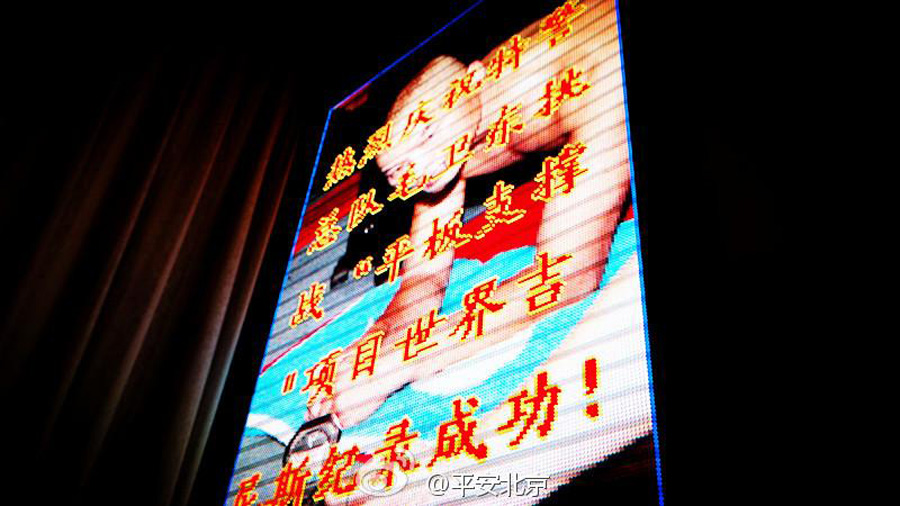 As reported by the official microblog site of Beijing Public Security Bureau on Sept. 26, Mao Weidong, a 43-year-old Special Weapons and Tactics (SWAT) member, breaks the Guinness World Record for "longest time in an abdominal plank position" with a record of four hours and twenty six minutes, smashing the previous three hours and seven minutes one set in 2013. "He wins not only physically, but also mentally! We are here cheering for him! Beijing SWAT Unit will always dedicate to ensure social security, preserve public order, protect people's lives as well as property and security of the capital," says the site. (Photo/weibo.com)