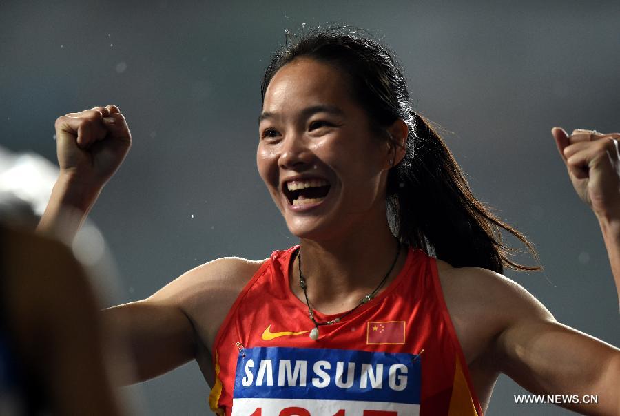 Wei Yongli of China celebrates after the women's 100m final of athletics at the 17th Asian Games in Incheon, South Korea, Sept. 28, 2014. Wei Yongli won the gold medal with 11.48 seconds. (Xinhua/Lin Yiguang)