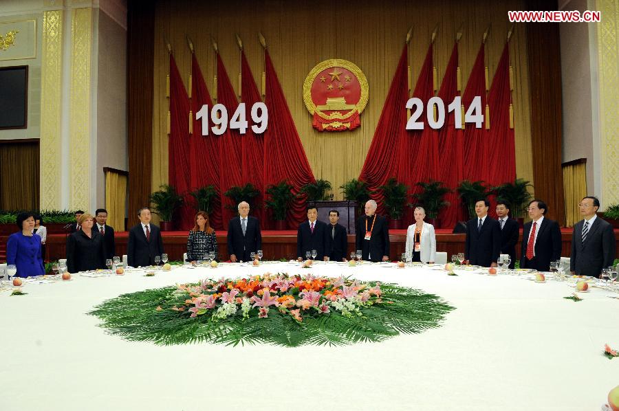 Liu Yunshan (C), a member of the Standing Committee of the Political Bureau of the Communist Party of China (CPC) Central Committee and secretary of the Secretariat of the CPC Central Committee, attends a reception for foreign experts on the eve of the 65th anniversary of the founding of new China, at the Great Hall of the People in Beijing, capital of China, Sept. 28, 2014. (Xinhua/Rao Aimin)