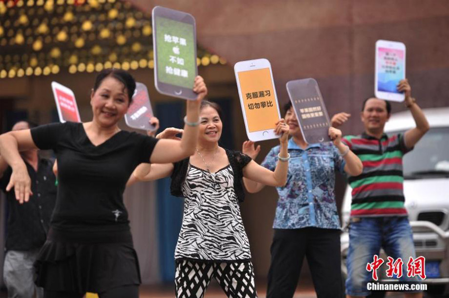 Holding paper models of iPhone6, damas dance to music "Little Apple" in the Foreigner Street in Chongqing on Sept. 26, 2014. They wanted to call for rational consumption on iPhone 6 through their dance. (CNS/Chen Chao)