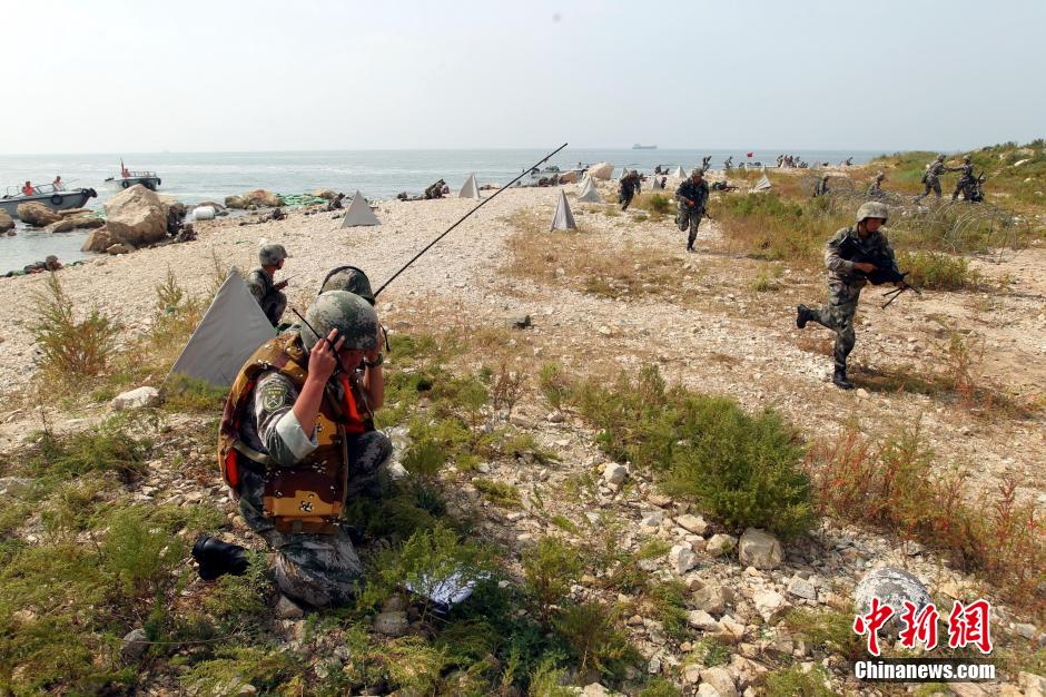 Nearly 6,000 troops of over 20 units from PLA Navy North Sea Fleet and Jinan Military Area Command conduct the "Joint-2014B" military drill in Bohai Bay from Sept. 25 to Sept. 27, 2014. (Chinanews.com/Qiu Chengliang)