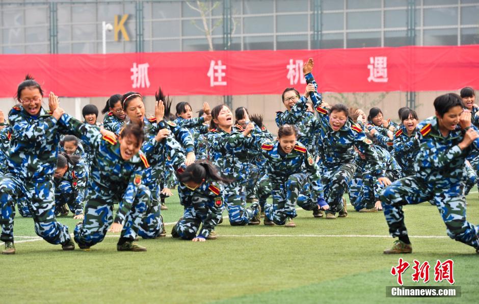 The ceremonial parade of the freshmen of Shandong University is held in Jinan, east China's Shandong province on Sept. 27, 2014. Female students were trained to use guns and to beat "enemies" in the course of catch and grapple. (CNS/Zhang Yong)
