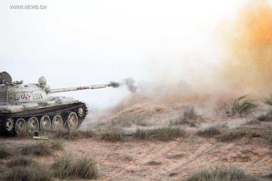 A Libya Dawn tank fires in Wershfana region in Tripoli, Libya, on Sept. 29, 2014. Heavy clashes continued between Libya Dawn fighters and local militias on Monday in Tripoli's Wershfana region. (Xinhua/Hamza Turkia)