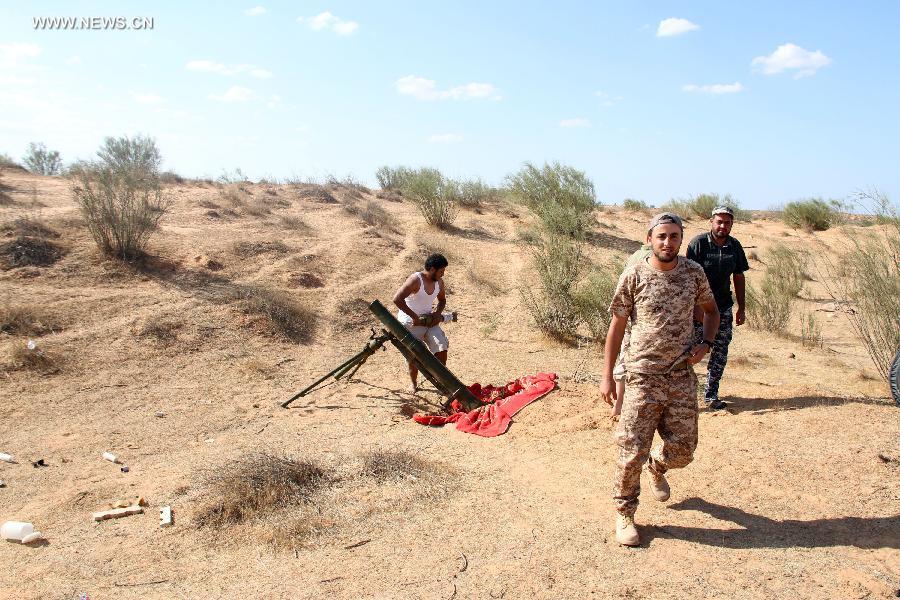 | Some Libya Dawn fighters set up a mortar in Wershfana region in Tripoli, Libya, on Sept. 29, 2014. Heavy clashes continued between Libya Dawn fighters and local militias on Monday in Tripoli's Wershfana region. (Xinhua/Hamza Turkia) |