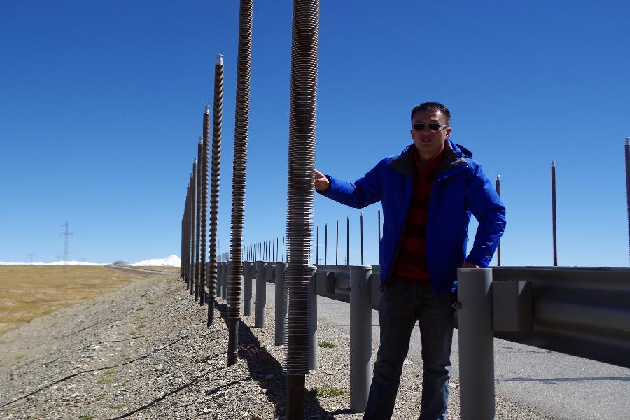 Photo taken on Sept. 19, 2014 shows Liu Ge, a researcher of frozen soil, standing on the Hol Xil part of Qinghai-Tibet highway, northwest China's Qinghai Province. In the past 12 years, Liu Ge worked on the Qinghai-Tibet Plateau every year from May to October, collecting data of frozen soil and meteorology. The year of 2014 marks the 60th anniversary of the opening of the Qinghai-Tibet highway. The highway, linking Xining, capital city of Qinghai province, and Lhasa, capital of the Tibet Autonomous Region, is a lifeline for Qinghai-Tibet Plateau. It boosts economic growth of regions along the road and makes lots of people's dreams come true. (Xinhua/Guo Qiuda)