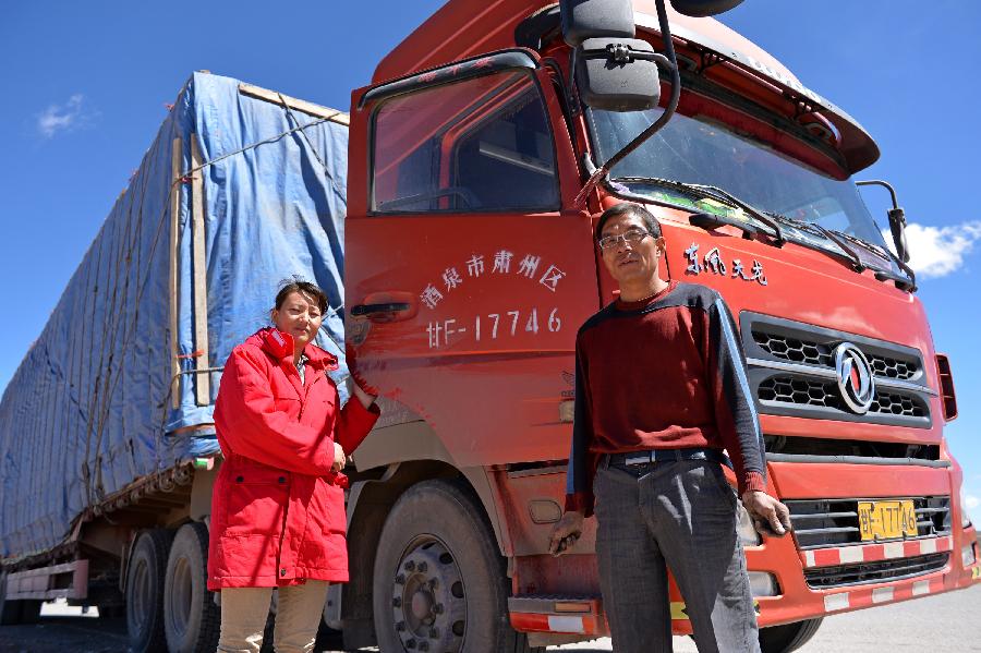 Photo taken on Sept. 19, 2014 shows Mr. Zhao (R) and his wife in front of a truck on the Hol Xil part of the Qinghai-Tibet highway, northwest China's Qinghai Province. Mr. Zhao is a truck driver working on the Qinghai-Tibet transportation line. The year of 2014 marks the 60th anniversary of the opening of the Qinghai-Tibet highway. The highway, linking Xining, capital city of Qinghai province, and Lhasa, capital of the Tibet Autonomous Region, is a lifeline for Qinghai-Tibet Plateau. It boosts economic growth of regions along the road and makes lots of people's dreams come true. (Xinhua/Liu Dongjun)