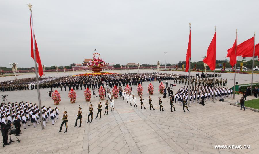 People rally to honor and remember the deceased national heroes at the Monument to the People's Heroes in Tian'anmen Square, downtown Beijing, capital of China, Sept. 30, 2014, on the occasion of the first Martyrs' Day. China's top legislature set Sept. 30 as Martyrs' Day last month. (Xinhua/Lan Hongguang)