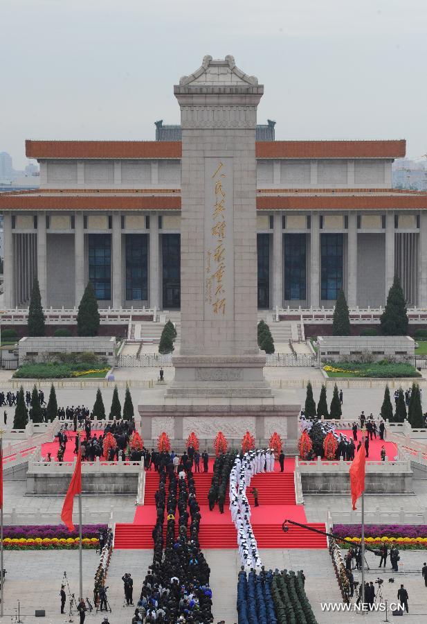 People rally to honor and remember the deceased national heroes at the Monument to the People's Heroes in Tian'anmen Square, downtown Beijing, capital of China, Sept. 30, 2014, on the occasion of the first Martyrs' Day. China's top legislature set Sept. 30 as Martyrs' Day last month. (Xinhua/Xie Huanchi)