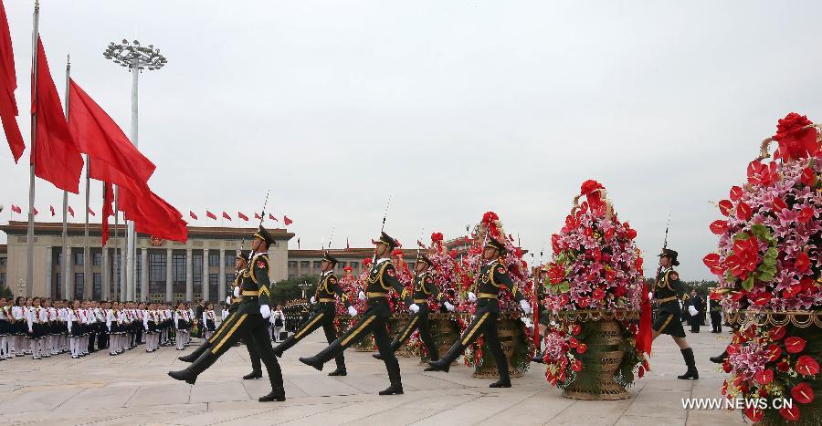 People rally to honor and remember the deceased national heroes at the Monument to the People's Heroes in Tian'anmen Square, downtown Beijing, capital of China, Sept. 30, 2014, on the occasion of the first Martyrs' Day. China's top legislature set Sept. 30 as Martyrs' Day last month. (Xinhua/Pang Xinglei)