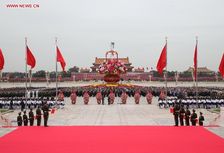 | Chinese leaders Xi Jinping, Li Keqiang, Zhang Dejiang, Yu Zhengsheng, Liu Yunshan, Wang Qishan and Zhang Gaoli offer flower baskets at the Monument to the People's Heroes in Beijing's Tian'anmen Square on Sept. 30, 2014, the first Martyrs' Day. (Xinhua/Yao Dawei) |
