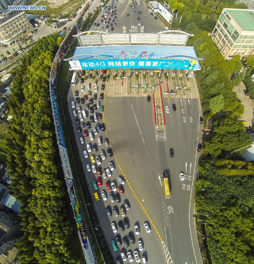 A traffic stream for going out of town makes a sharp contrast with an empty driveway for entering town at a toll station of express way on the first day of the Chinese National Day holidays in Hangzhou, capital of east China's Zhejiang Province, Oct. 1, 2014. The "golden-week" National Day holidays are expected to bring a tourism peak across the country. (Xinhua/Xu Yu)
