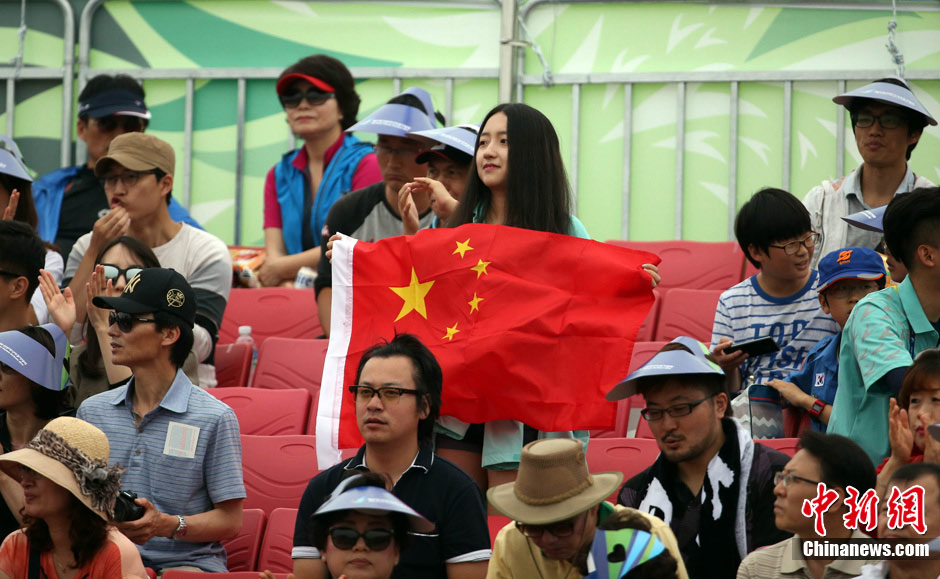 Zhou Qi shows her support for Chinese team during a beach volleyball event in Incheon, Sept. 28, 2014. (Chinanews.com/Tang Yanjun)