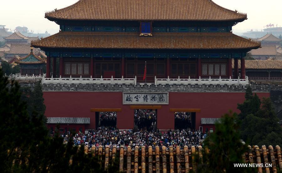 The northern gate of the Palace Museum is crammed with tourists on the second day of the Chinese National Day holidays in Beijing, capital of China, Oct. 2, 2014. Almost all scenic spots in Beijing were packed with tourists on the second day of the National Day holidays, which falls from Oct. 1 to Oct. 7. The 26 mainly monitored scenic spots of Beijing received 542,000 trips on Oct. 1, up 32.8 percent over the same day of last year. (Xinhua/Jin Liangkuai)