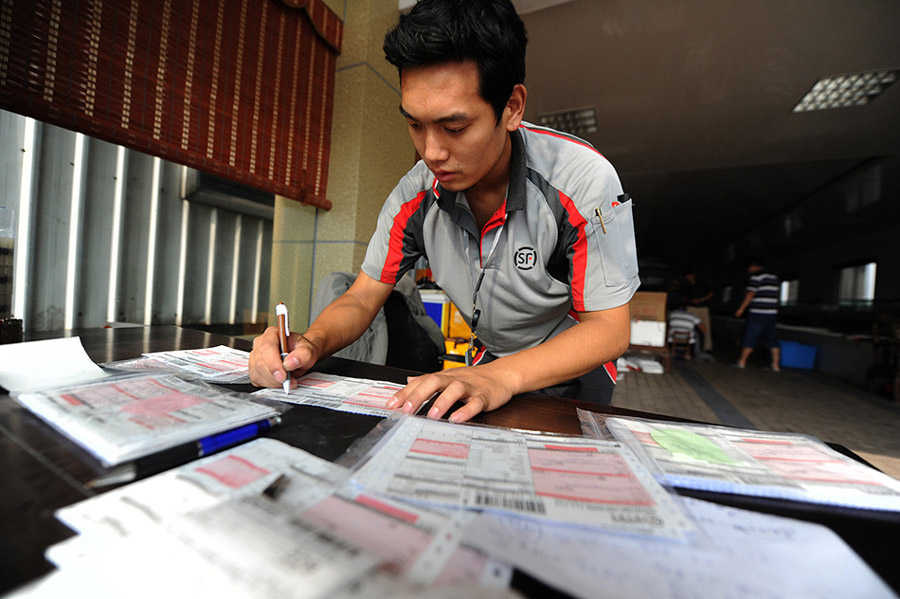 A deliveryman at Kunshan, a city in Jiangsu province well-known for its hairy crabs, checks delivery orders countrywide. [Photo/Xinhua]