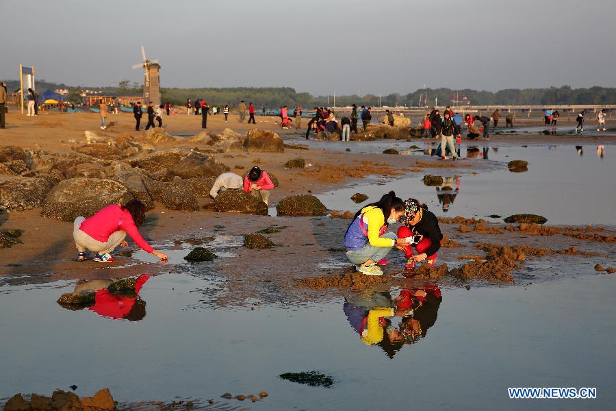 People enjoy themselves on the shoals in Qinhuangdao City, north China's Hebei Province, Oct. 4, 2014. Many people came to Qinhuangdao, a famous tourist city in north China, during the seven-day National Day holiday. (Xinhua/Yang Shiyao)