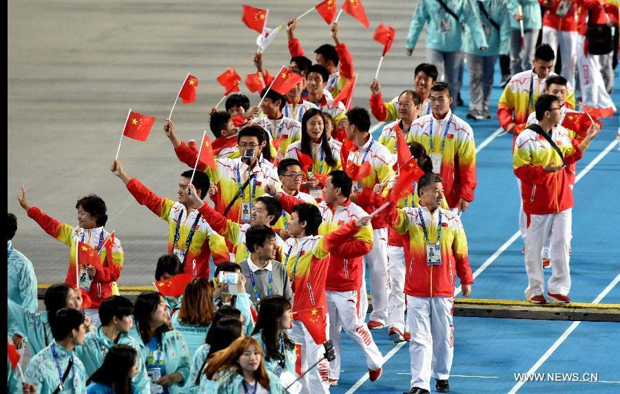 Chinese athletes parade during the closing ceremony of the 17th Asian Games at the Incheon Asiad Main Stadium in Incheon, South Korea, Oct. 4, 2014. (Xinhua/Zheng Huansong)