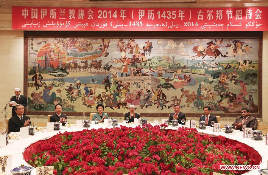 Chinese Vice Premier Liu Yandong (3rd L), E'uigen Iminbaha (5th L), vice-chairman of China's National People's Congress Standing Committee, Ling Jihua (2nd L), vice chairman of the National Committee of the Chinese People's Political Consultative Conference (CPPCC), Wang Zhengwei (6th L), vice chairman of the CPPCC National Committee, and Ma Biao (1st L), also vice chairman of the CPPCC National Committee, attend the reception held by the Islamic Association of China (IAC) to celebrate Corban Festival, or Eid al-Adha, in Beijing, capital of China, Oct. 4, 2014. (Xinhua/Ding Lin)