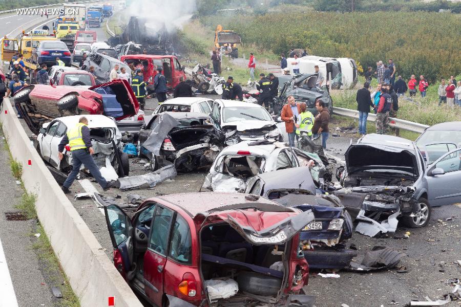Photo taken on Oct. 5, 2014 shows the site of a 40-car pile-up near Thessaloniki, Greece. At least four people were killed in a 40-car pile-up in northern Greece on Sunday, local authorities said. According to medical sources, there were 14 persons injured in the multiple vehicles accident. (Xinhua)