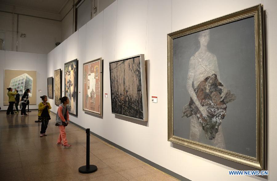 Visitors look at artworks during the 12th National Exhibition of Fine Arts · Painting with Various Materials at the Hebei Museum in Shijiazhuang, capital of north China's Hebei Province, Oct. 7, 2014. (Xinhua/Wang Xiao)