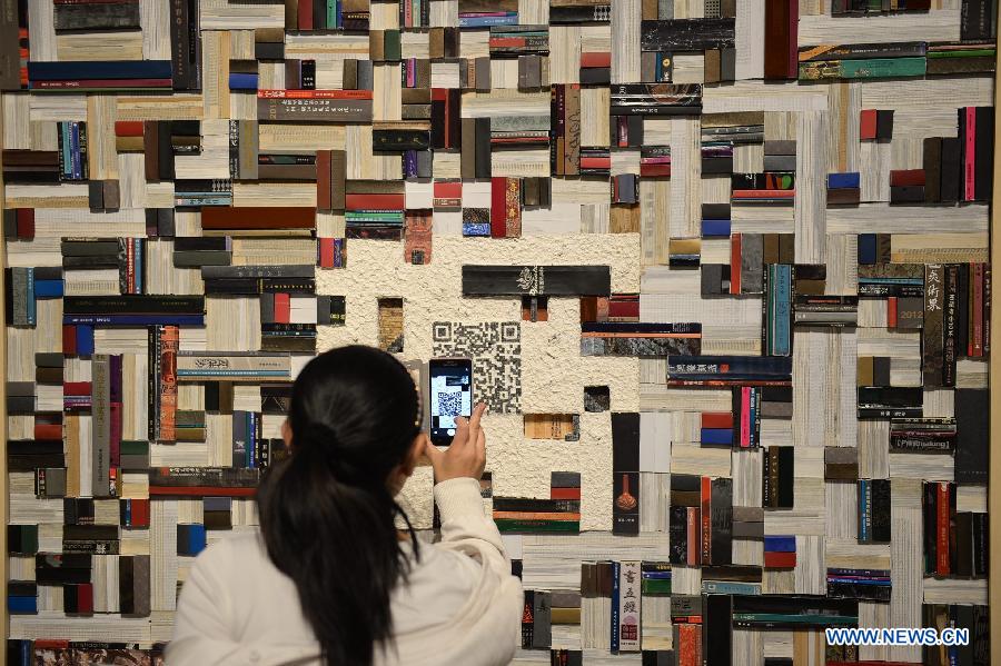 A visitor looks at artworks during the 12th National Exhibition of Fine Arts · Painting with Various Materials at the Hebei Museum in Shijiazhuang, capital of north China's Hebei Province, Oct. 7, 2014. (Xinhua/Wang Xiao)