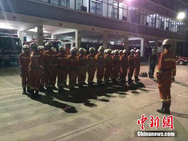 14 fire trucks, 55 firefighters and 2 rescue dogs from Honghe county head to the quake struck area at 11:30 p.m. on October 7. (Chinanews/Zhong Xin)