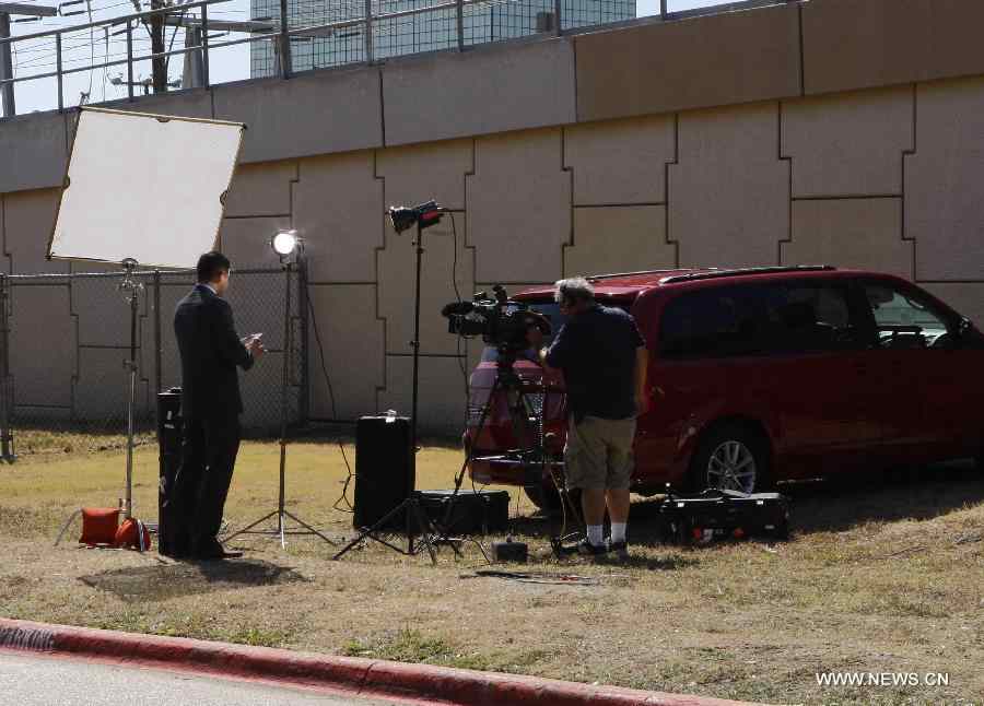 Media personnel conduct report at Texas Health Presbyterian Hospital, where Thomas Eric Duncan got treated, in Dallas, the United States, Oct. 7, 2014. Thomas Eric Duncan, the first Ebola patient diagnosed in the United States, died Wednesday morning in Dallas, a city in the northern part of the U.S. state of Texas, hospital officials announced. (Xinhua/Song Qiong)