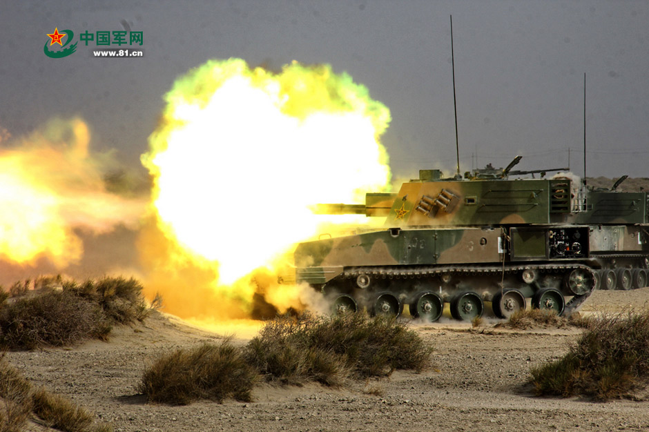 An artillery regiment of Xinjiang Military Region conducts a live-fire tactical drill in the desert on Sept. 26, 2014. (www.81.cn/Wang Xuezhen and Cheng Qizhang)