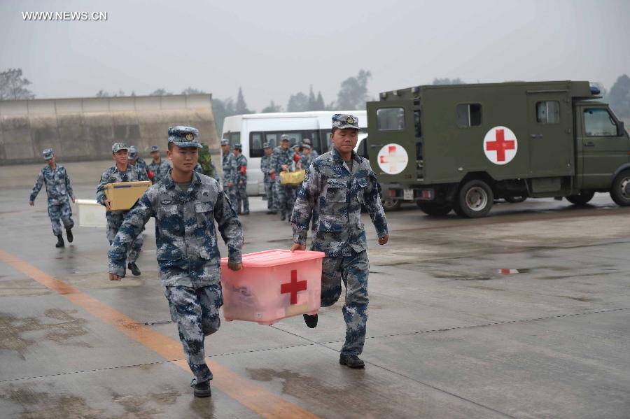 Soldiers load medical supplies for quake-hit areas at the Qionglai Airport in southwest China's Sichuan Province, Oct. 8, 2014. Medical staff and supplies from Chengdu Air Force have arrived at the Jinggu County on Wednesday. A 6.6-magnitude quake jolted Yunnan Province Tuesday night. (Xinhua/Xue Yubin)