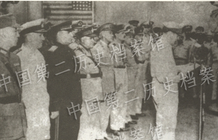 General of the Army Douglas MacArthur read his speech at the surrender ceremony on Sept. 2, 1945.(Photo/Second Historical Archives of China)