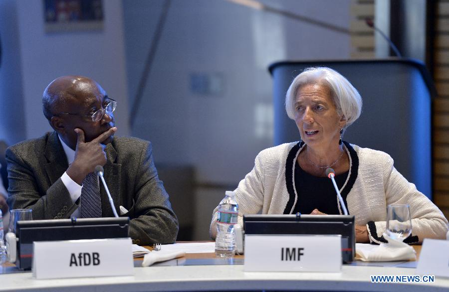 Christine Lagarde(R), Managing Director of International Monetary Fund and Donald Kaberuka, President of African Development Bank, attend a meeting discussing the Ebola impact, possible solutions and how to support countries affected by the Ebola crisis, at the World Bank in Washington D.C., the United States, Oct. 9, 2014. (Xinhua/Yin Bogu)